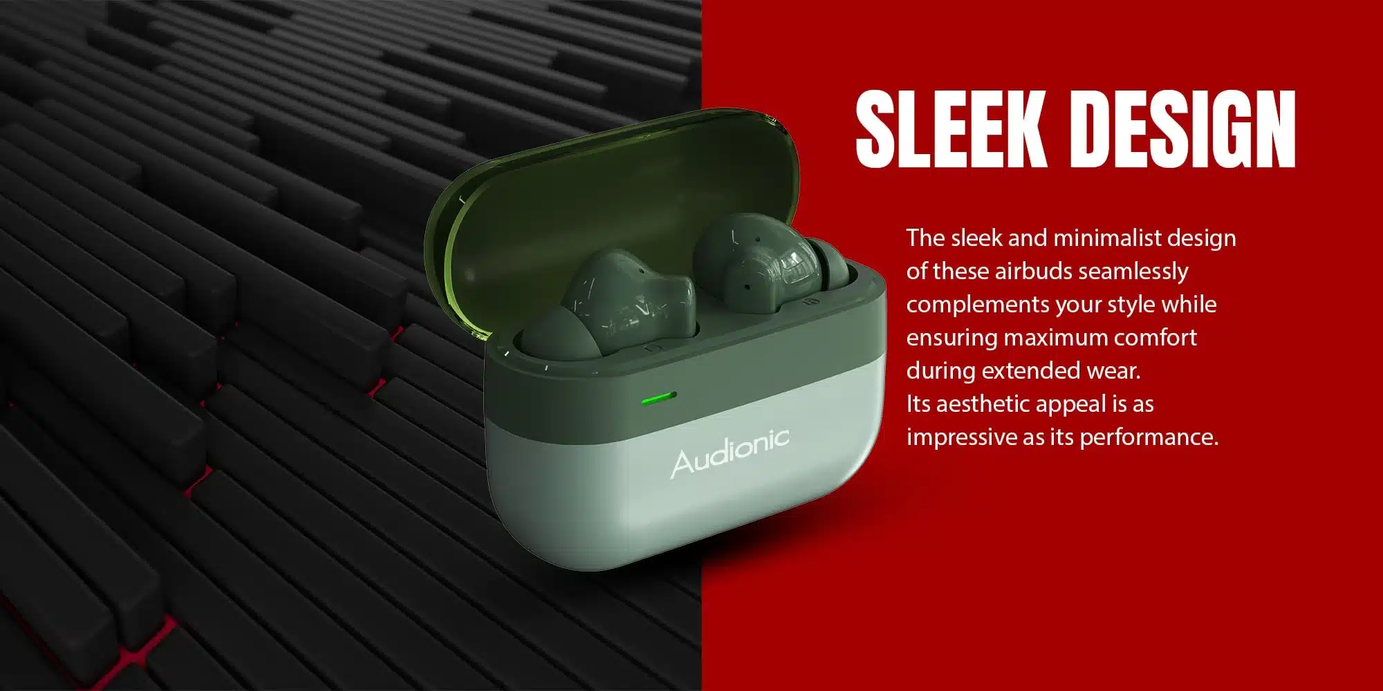 Sleek Design, The Sleek and minmalist design of these airbuds seamlessly complements your style while ensuring maximum comfort during extended wear. its aesthetic appeal is as impressive as its performance.