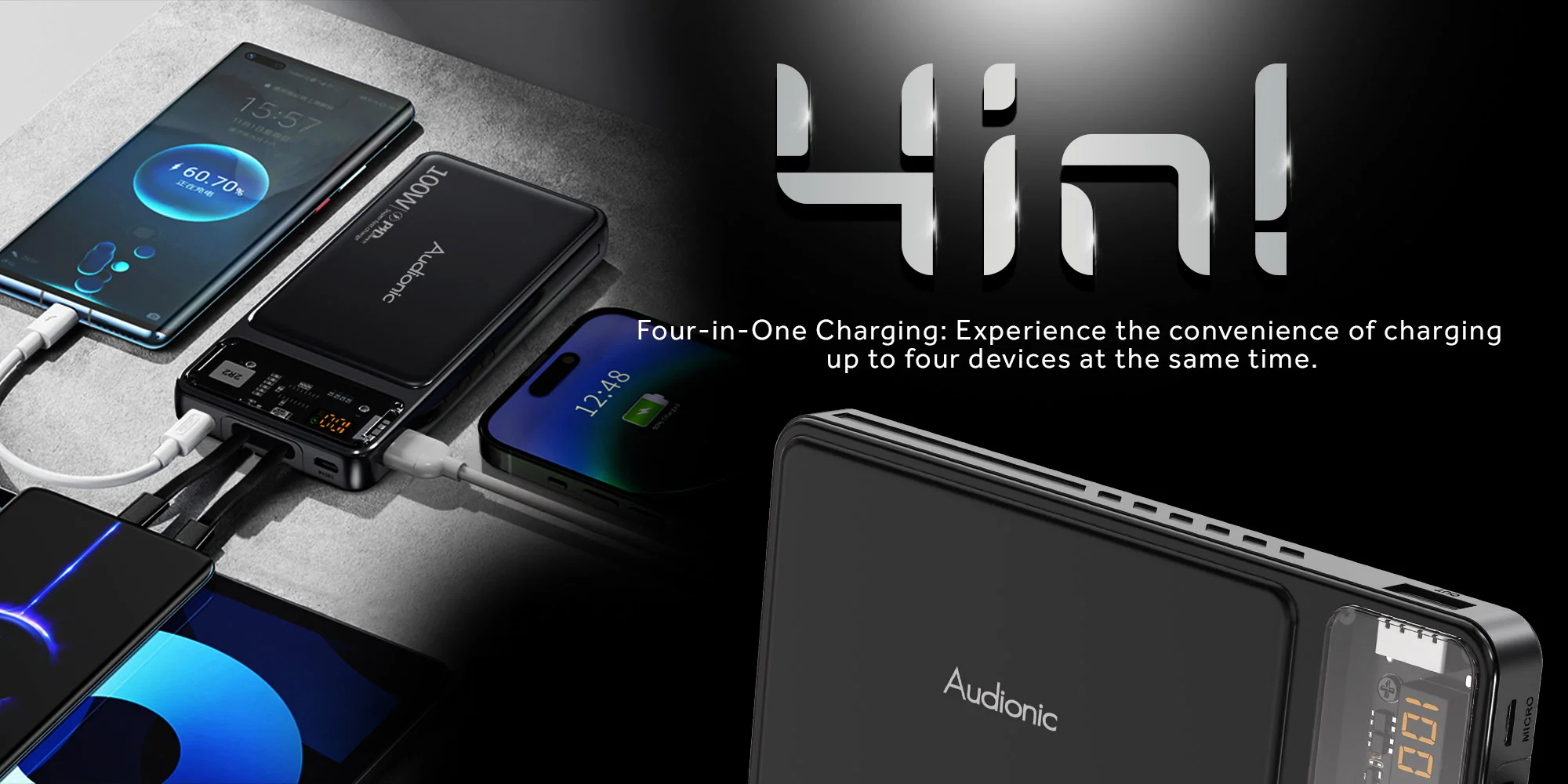 A: You can charge up to four devices simultaneously using the USB port, Type-C line, and Lightning line provided. The power bank supports charging multiple devices at the same time.