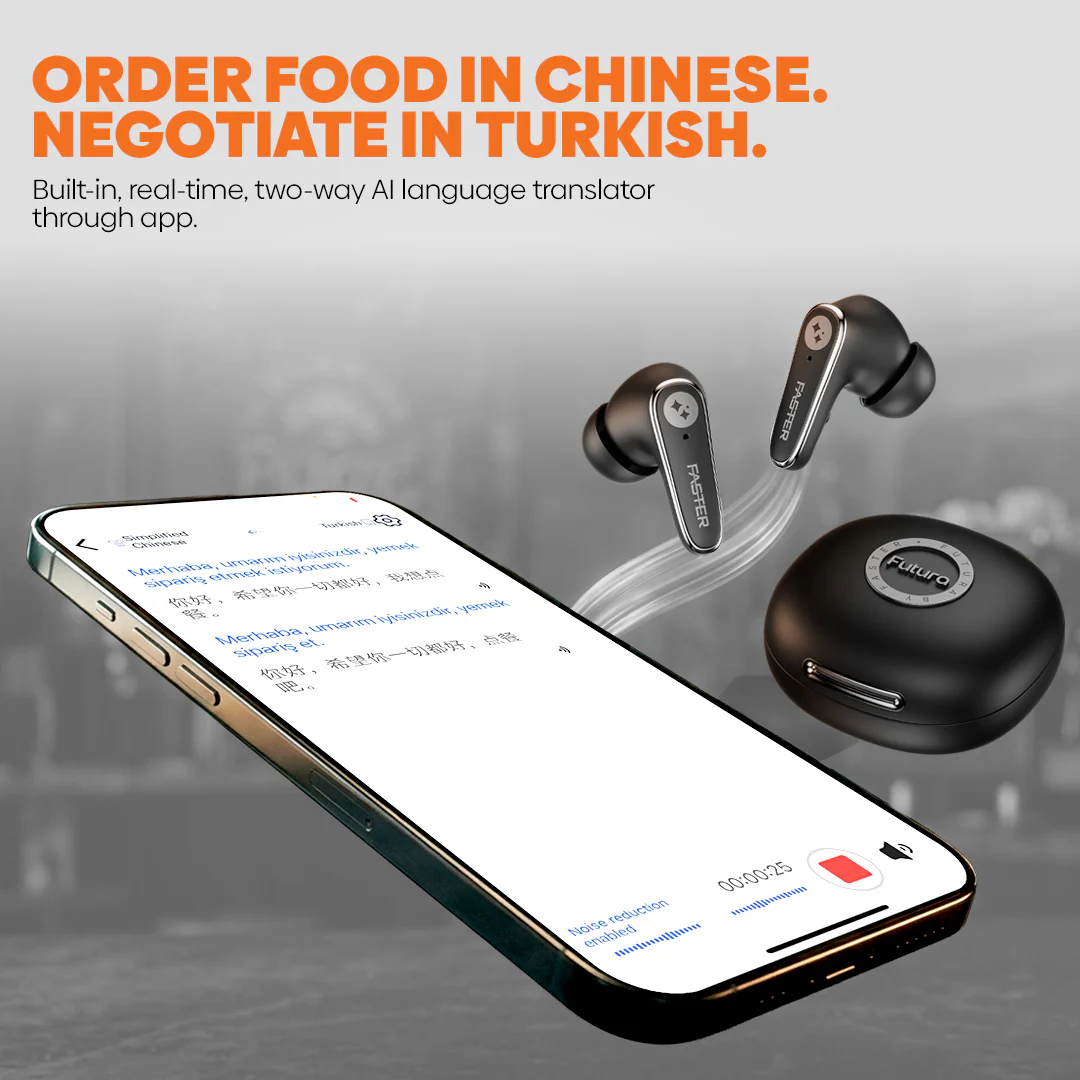 The Futura ANC earbuds are easy to use and operate like any other earbuds to play music and make calls. To use translation, scan the QR code, install the application, after which your earbuds are connected to the App. The app has several modes that suit various situations.- The real-time translation will translate nearby speech to the language of your choice right in your earphones.