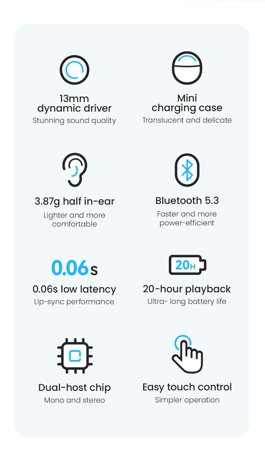 - Cutting-edge Qualcomm® Chip. QCC3020 for a more stable and faster connection