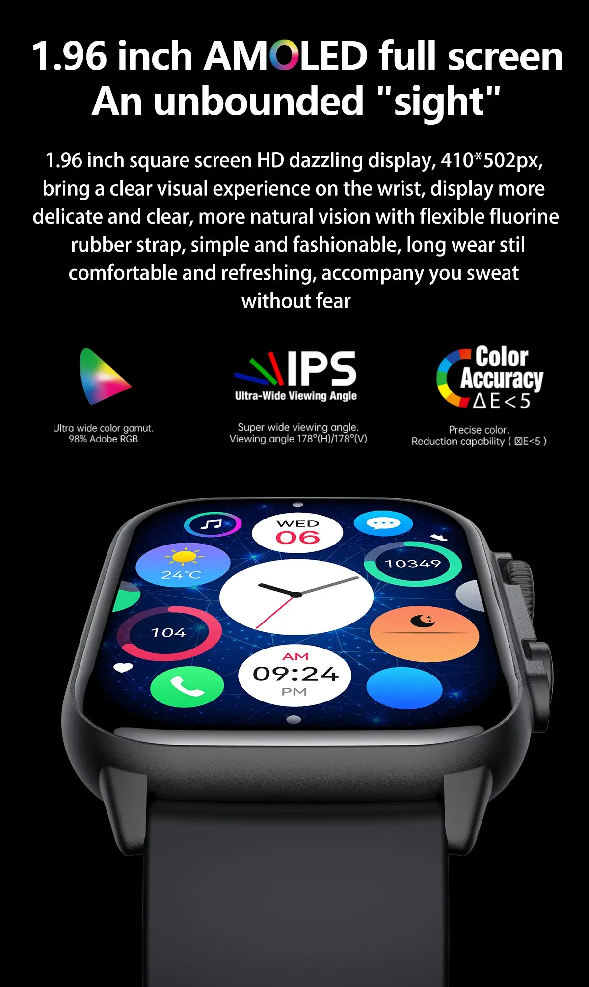 - 2.12 Inch 485 * 520 dpi AMOLED large high-definition full touch screen.