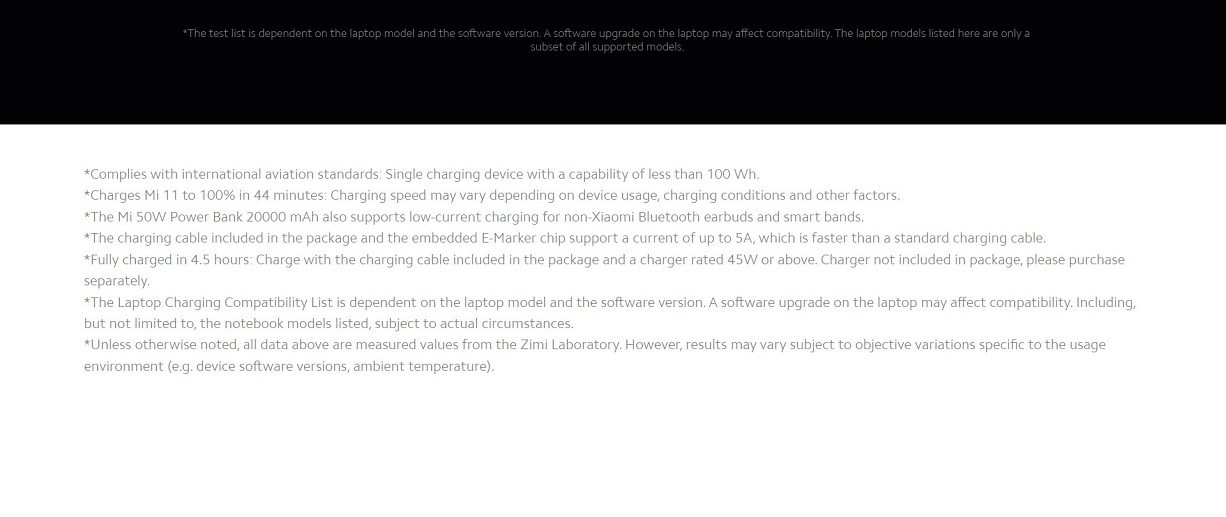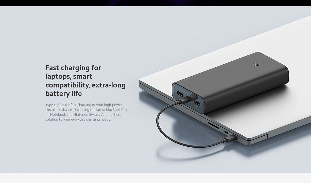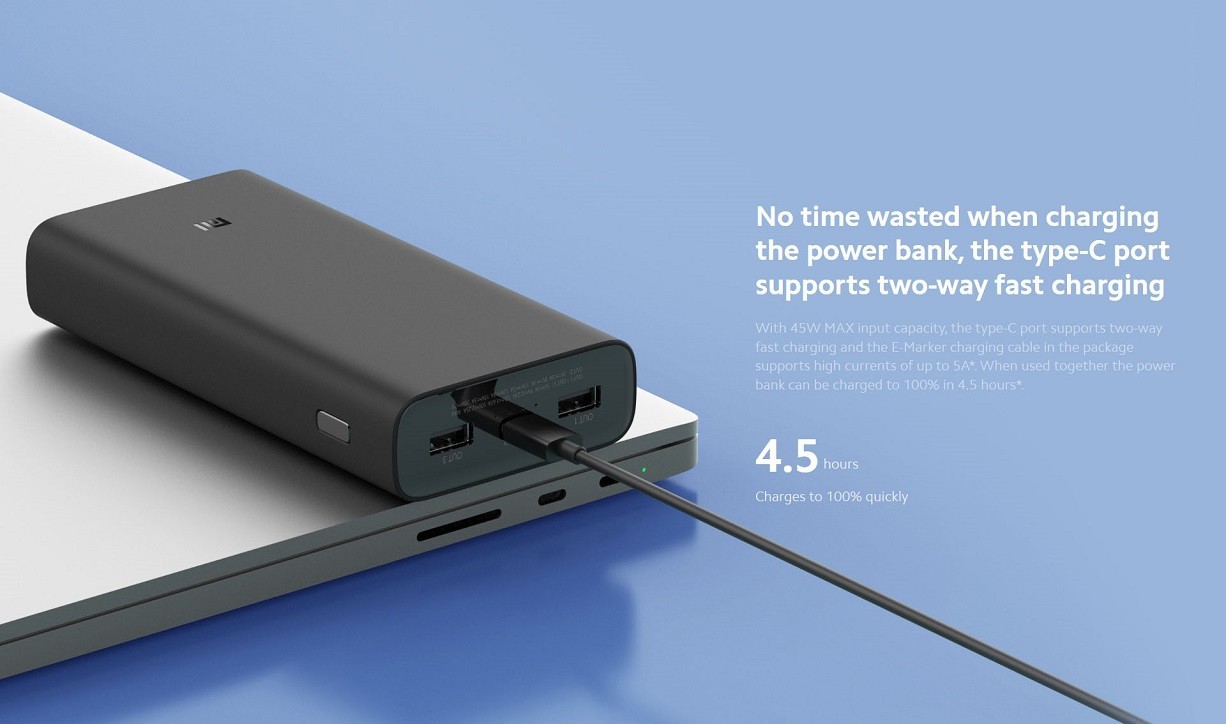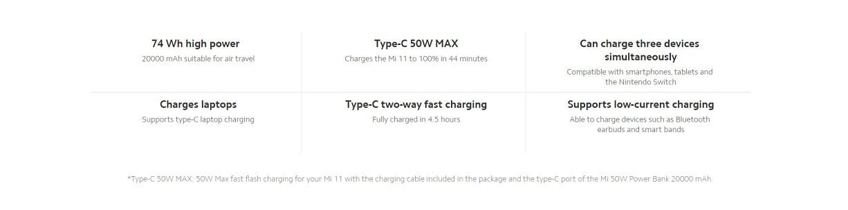 74 Wh high power | 20000mah suitable for air travel | Type-C 50W max chargers the Mi 11 to 100% in 44 minutes | Can charge three devices simultaneously | Chargers laptops supports type-C laptop Charging | Type-C two-way fast charging fully charged in 4.5 hours, Supports low current charging