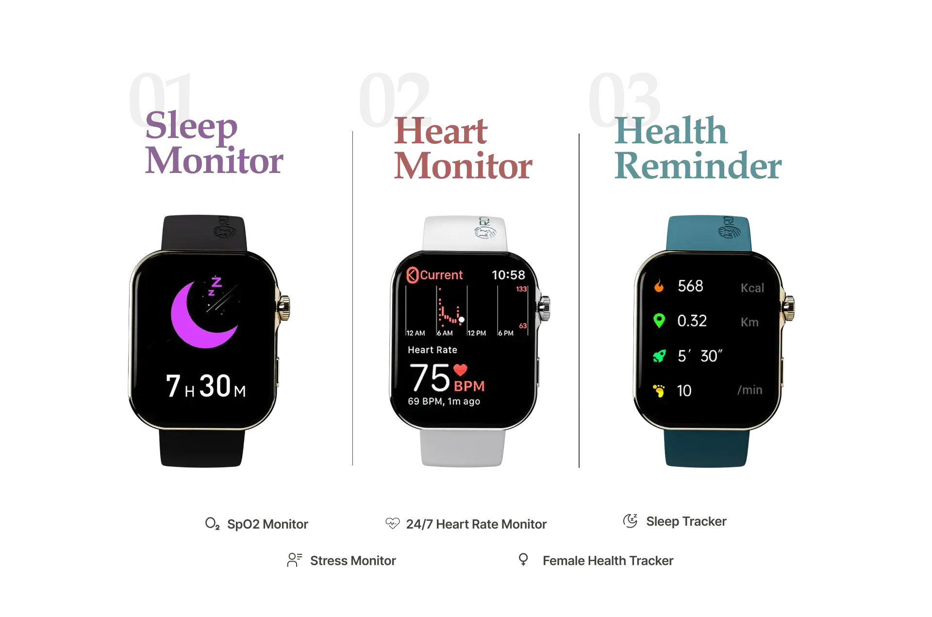 - Health tracker: Heart rate monitor, Sleep monitor, Blood Oxygen
