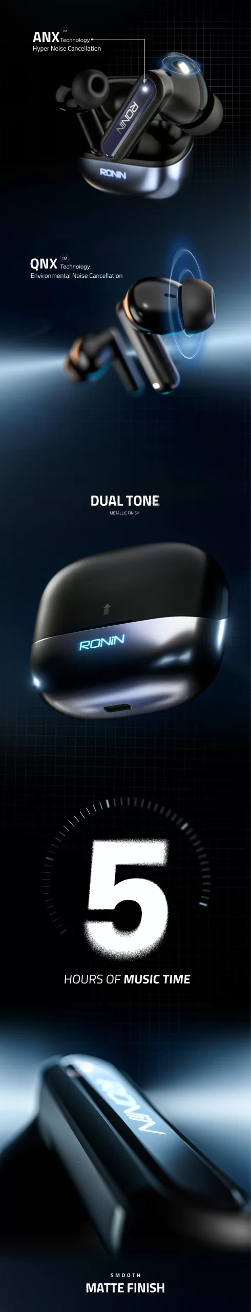 Ronin Vox Earbuds 7085 Hybrid ANC & ENC | 40 Hr Playtime