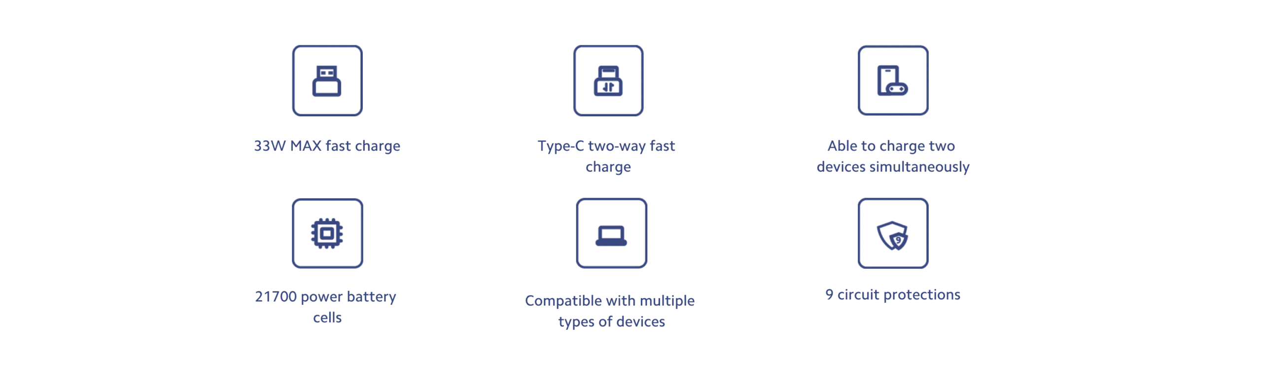 - Multiple Fast charge protocols: Support multiple fast charging protocols such as PD and QC3+