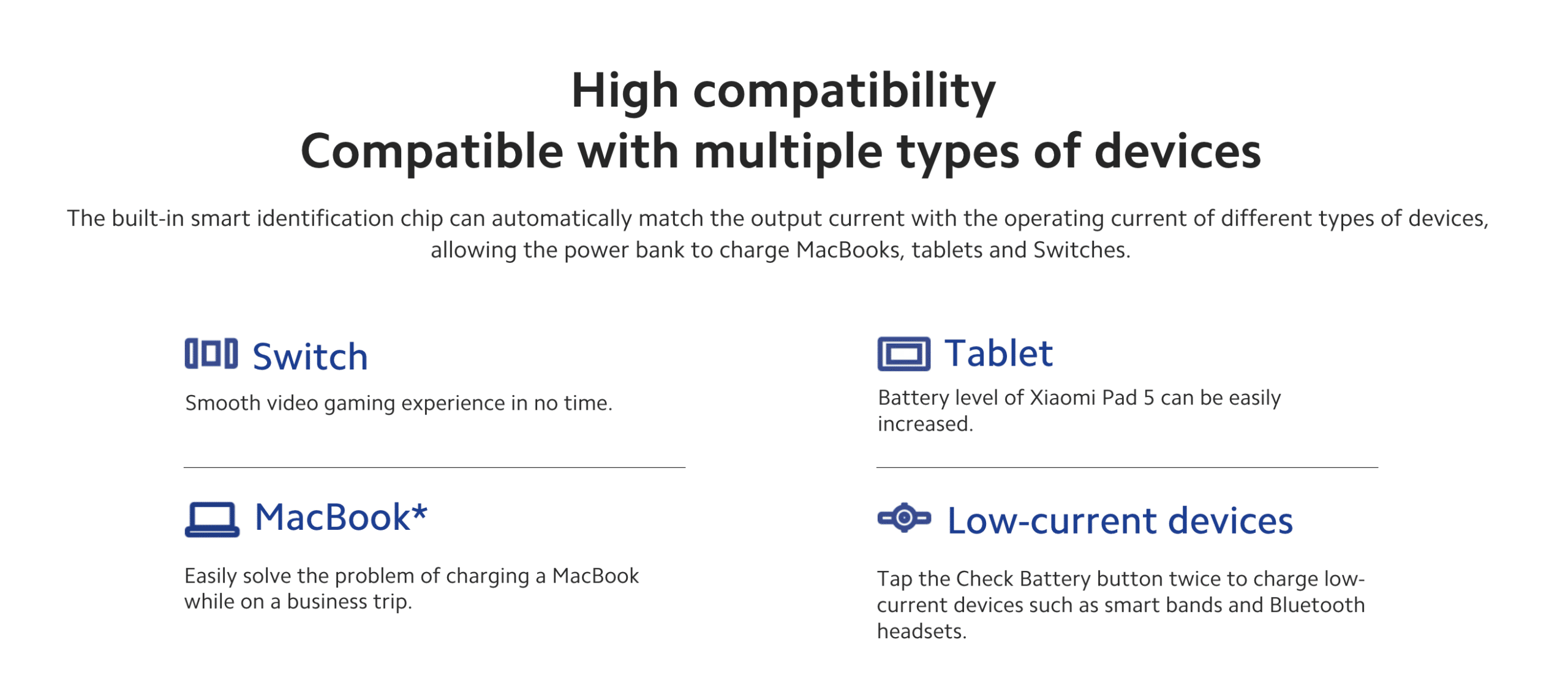 - Support low current charging for Bands, Earbuds etc.