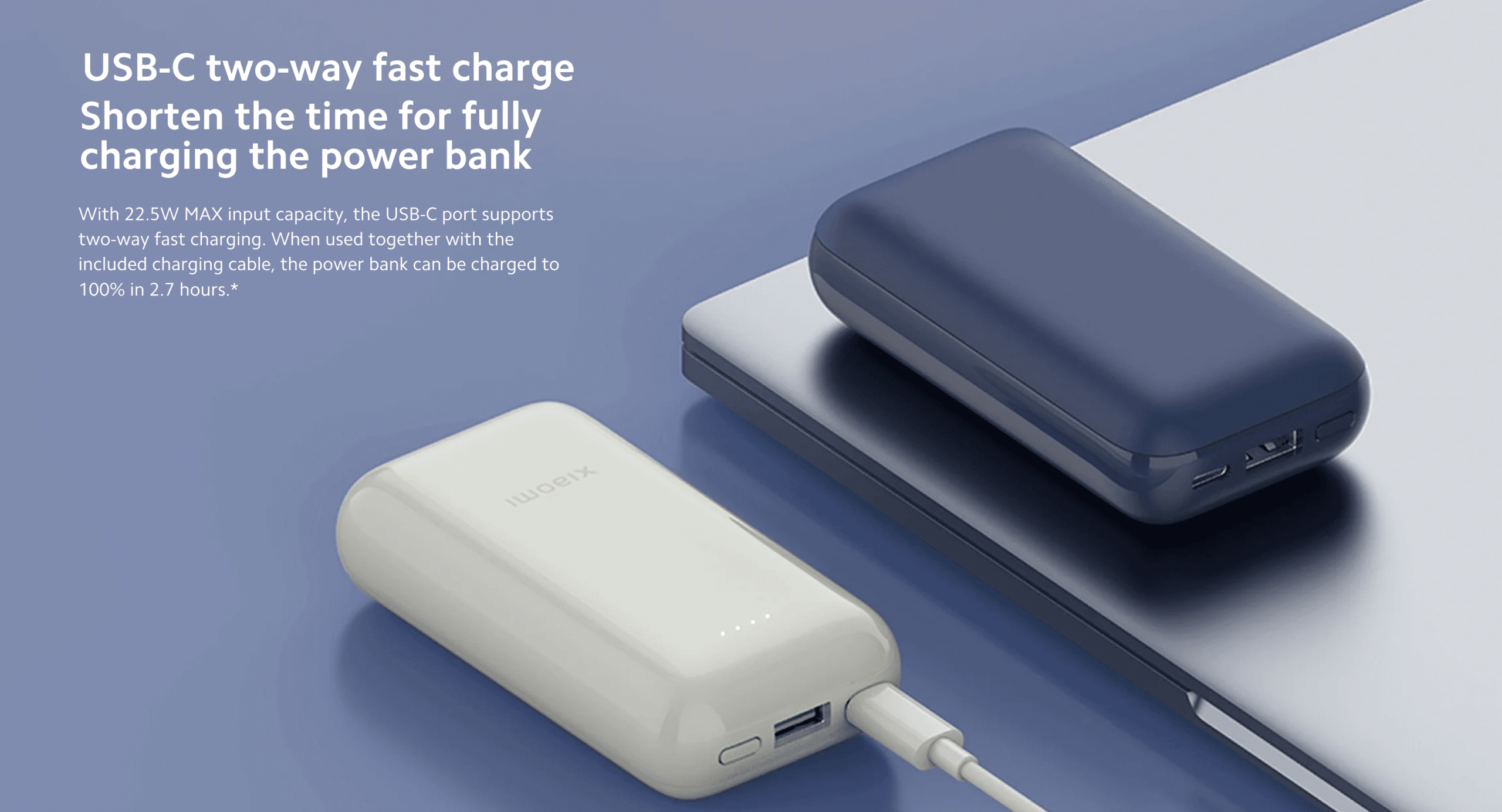 With 22.5W MAX input capacity, the USB-C port supports two-way fast charging. When used together with the included charging cable, the power bank can be charged to 100% in 2.7 hours.*