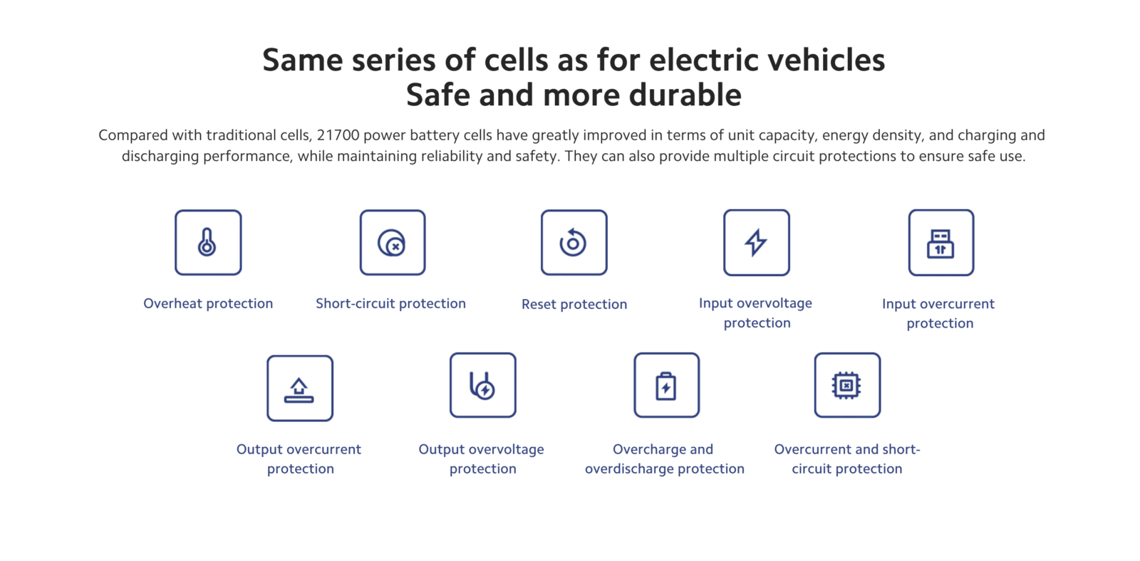 - 21700 power battery cells – Same series of cells as for electric vehicles – Safe and more durable