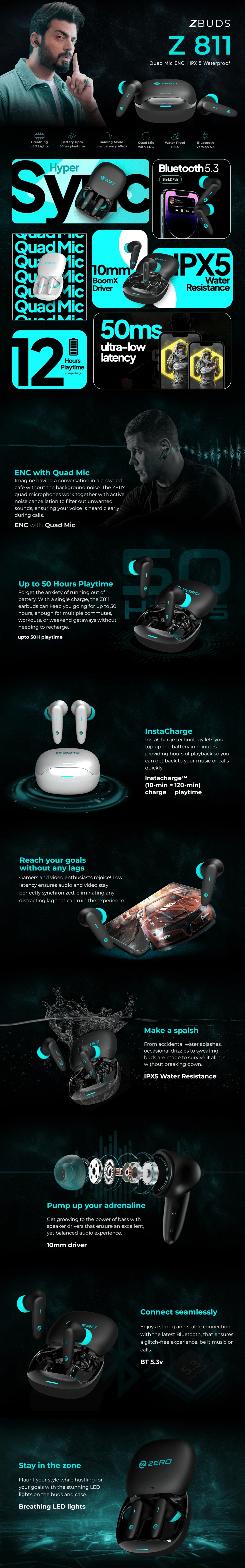 Meet your all day audio companion with the best selling Z811 Earbuds giving you upto 50 Hours of Playtime, IPX5 Water Resistance with Quad Mic ENC, giving you the best in class features in a sleek flip design.